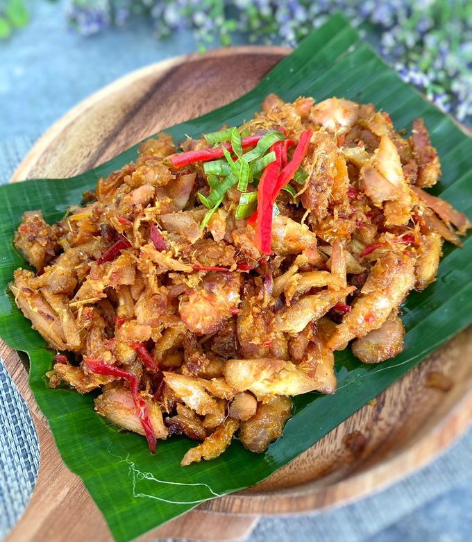 Daging ayam yang telah dingin kemudian dipotong kecil-kecil atau dihancurkan menggunakan ulekan tradisional hingga teksturnya menjadi lembut dan agak hancur. Proses ini bertujuan agar daging lebih mudah menyerap bumbu dan memiliki tekstur yang khas. Setelah itu, ayam yang sudah dihancurkan dicampur dengan bumbu halus yang telah dibuat sebelumnya, lalu diaduk rata agar rasa meresap ke seluruh bagian daging. Kadang-kadang, proses ini juga melibatkan pemanasan kembali agar bumbu lebih meresap dan daging menjadi lebih empuk.
